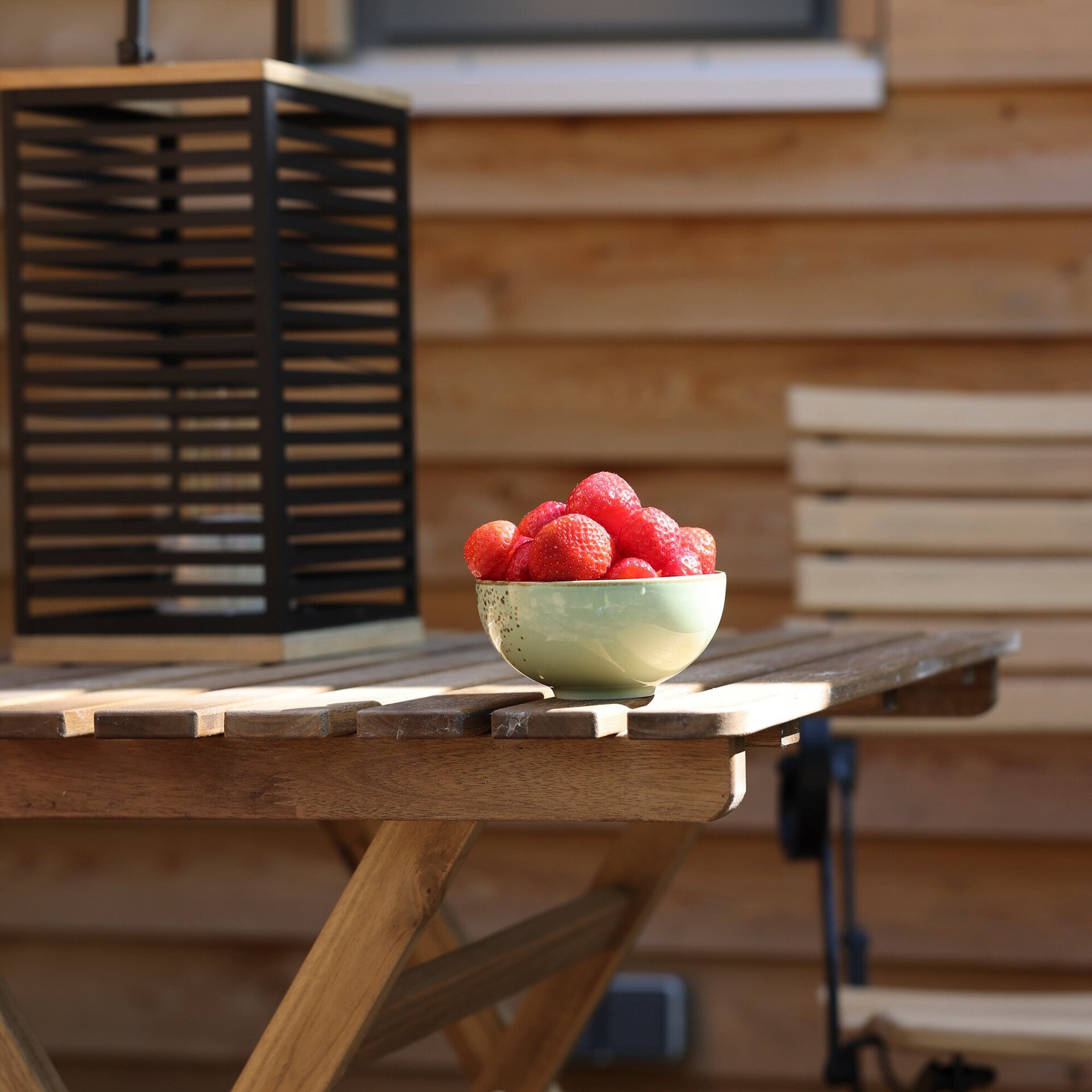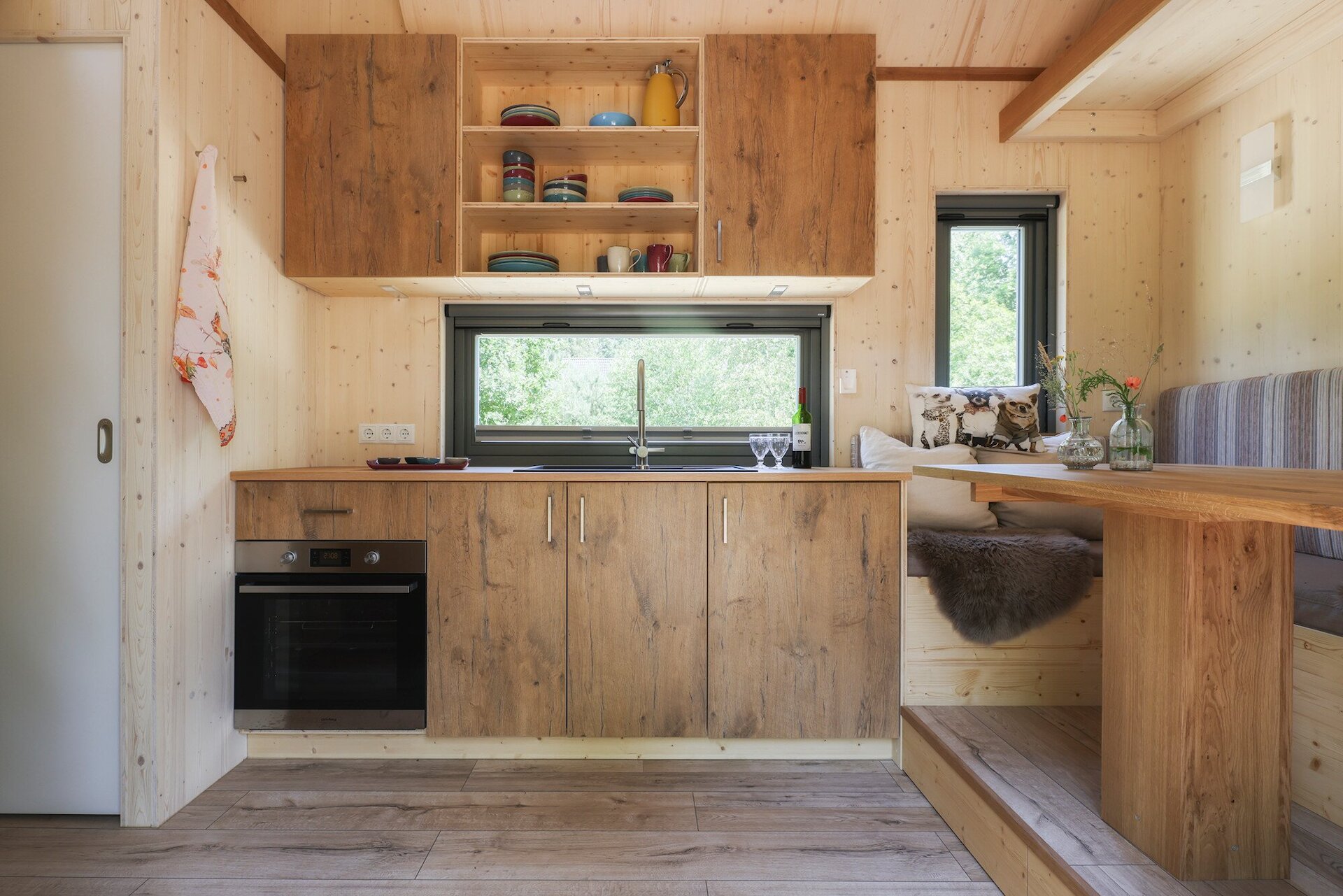 Der Innenbereich beeindruckt mit einer voll ausgestatteten Küche mit großem Essbereich, zwei Schlafräumen, Toilette und Dusche getrennt und viel Stauraum. Eine großzügige Terrasse mit schönen Möbeln sorgt auch für Wohlfühlatmosphäre aussen.